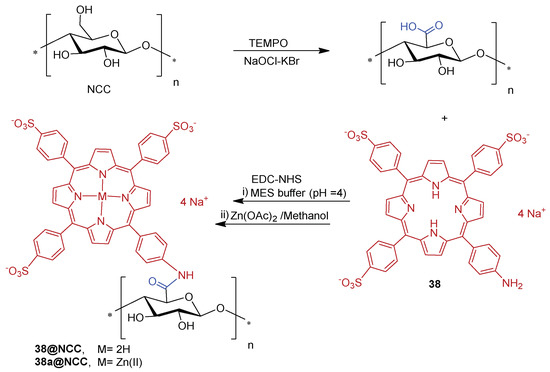 - Chauhan, P.; Hadad, C.; Sartorelli, A.; Zarattini, M.; Herreros-Lopez, A.; Mba, M.; Maggini, M.; Prato, M.; Carofiglio, T. Nanocrystalline cellulose-porphyrin hybrids: Synthesis, supramolecular properties, and singlet-oxygen production. Chem. Commun. 2013, 49, 8525–8527. [Google Scholar]