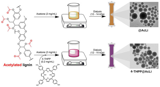 - Marchand, G.; Fabre, G.; Maldonado-Carmona, N.; Villandier, N.; Leroy-Lhez, S. Acetylated lignin nanoparticles as a possible vehicle for photosensitizing molecules. Nanoscale Adv. 2020, 2, 5648–5658. [Google Scholar] [CrossRef] [PubMed]