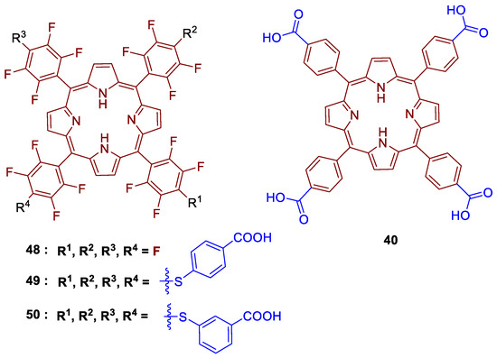 Synthetic meso-tetraarylporphyrins (tArPs) are versatile compounds (Figure 13), readily accessible by facile and straightforward condensation reactions using pyrrole and aldehydes or dipyrromethanes/tripyrranes as starting materials [153,154]. Their chemical stability, photophysical features, and ability to fine-tune the electronic properties, makes tArPs a multipurpose platform for the preparation of materials with light-harvesting properties capable to generate ROS, namely 1O2 [76,155].