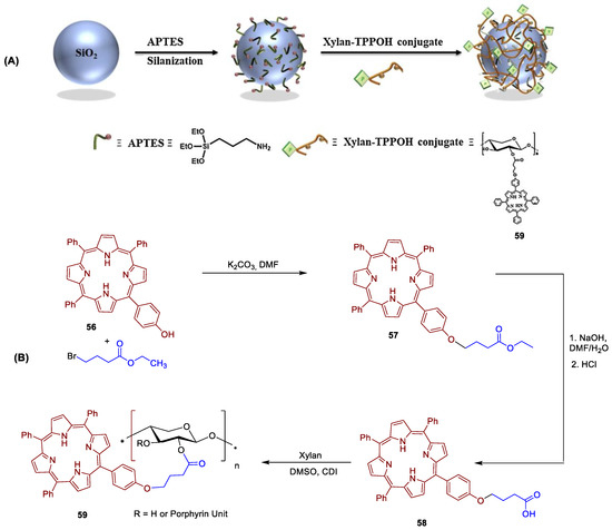 - Bouramtane, S.; Bretin, L.; Pinon, A.; Leger, D.; Liagre, B.; Richard, L.; Bregier, F.; Sol, V.; Chaleix, V. Porphyrin- xylan-coated silica nanoparticles for anticancer photodynamic therapy. Carbohydr. Polym. 2019, 213, 168–175. [Google Scholar] [CrossRef]
