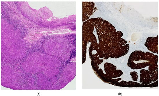 All cases show non-keratinized (“basaloid”) and mixed-type (“keratinized” and “basaloid”) SCC morphology [] and positive p16 immunohistochemical staining according to the Lewis et al., criteria (Figure 1b) [].