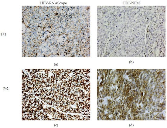 HR-HPV ISH and IHC of NPM protein in OPSCC (a,c) RNAScope ISH showing mild/moderate and large amounts of E6/E7 mRNA HR-HPV, respectively, (b,d) representative images of NPM IHC staining of same patients (Pt1, Pt2) depicted in (a,c). Weak and intense staining correlates with the amount of E6/E7 mRNA.