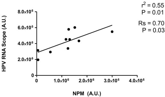 Interestingly, NPM IHC intensity positively correlated with high-risk HPV mRNA-IHS in OPSCC (Rs = 0.70, p = 0.03) (Figure 3). Moreover, a linear relationship was found between NPM IHC and HR-HPV mRNA, detected by RNAScope (Figure 3). Our data indicate that NPM is a positively signed direct regressor for HR-HPV mRNA expression. Thus, NPM expression level could be a predictor of HR-HPV mRNA levels with an average increase of 1.15 units for each 1-unit increase in NPM expression level. The “true” mean increase could plausibly be expected to lie between 0.30 and 2.00 (95% confidence interval). The r2 suggests that about 55% of the variability in the HR-HPV mRNA can be explained by its relationship with NPM expression. The results show that NPM and E6/E7 mRNA HR-HPV positivity were very similar in patients’ categorization.