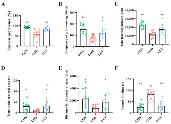 Compared with the CON group, the sucrose preference, the number of grid crossings and the total distance traveled were all reduced in LOD rats (p < 0.01). Likewise, LOD rats showed a decrease in the distance and time traveled in the central area in the open field test (OFT) (p < 0.05) and a significant increase of immobility time in the forced swimming test (FST) (p < 0.01). When treated with LUT, rats showed an increase in sucrose preference, number of grid crossings, and total distance traveled, as well as a decrease in immobility time. In comparison with the LOD rats, the distance and time spent in the central zone of the OFT were increased in the LUT rats. This indicated that LUT significantly ameliorated depression, anxiety, and despair in LOD rats (Figure 1).