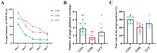 Spatial exploration experiments illustrated that LUT exerted a beneficial effect on improving memory function in LOD rats. The number of platform crossings in LOD rats was markedly inferior to the number of platform crossings in CON rats (p < 0.01). Following LUT treatment, the number of platform crossings and the time ratio of the quadrant in which the platform was located rose in LOD rats (Figure 2B,C).