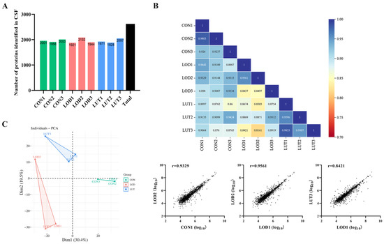 A general description of cerebrospinal fluid (CSF) proteomics data. (A) The number of proteins identified in each group of CSF (n = 3). (B) Correlation heat map and scatter plots of CSF protein data for each sample (n = 3). (C) Principal component analysis plot displaying the intergroup variability of CSF proteomics data for each sample.