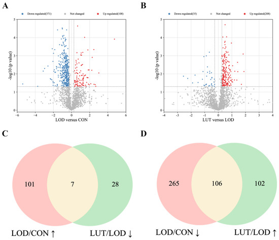 The proteins of each sample in the CON, LOD, and LUT groups were examined using data independent acquisition (DIA) proteomics technology, and a total of 2620 proteins were recognized (Figure 3A).