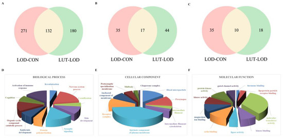 Gene Ontology (GO) annotation results for LUT treatment of LOD derived from CSF proteomics data. (A) GO annotation results for biological processes (BPs); (B) GO annotation results for cellular components (CCs); and (C) GO annotation results for molecular functions (MFs). (D) A total of 132 GO-BPs were co-regulated by LOD/CON and LUT/LOD. The p-values of GO-BPs for the above LUT/LOD were ranked, and the top ten significant GO-BPs were then displayed in pie diagrams. (E) A total of 17 GO-CCs were co-regulated by LOD/CON and LUT/LOD. The p-values of GO-CCs for the above LUT/LOD were ranked, and the top ten significant GO-CCs were then displayed in pie diagrams. (F) A total of 10 GO-MFs were co-regulated by LOD/CON and LUT/LOD. The p-values of GO-MFs for the above LUT/LOD were ranked and displayed in pie diagrams.