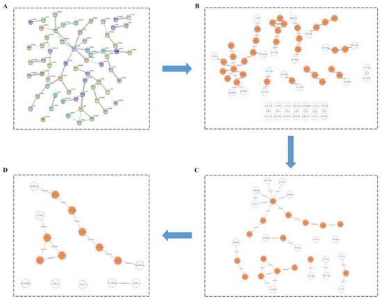 2.3.4. HUB Gene Analysis of the Treatment of LOD by LUT through a Protein–Protein Interaction (PPI) Network