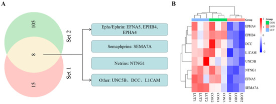 Eight potential targets on the axon guidance pathway for the LUT treatment of LOD. (A) Eight potential targets of LUT for LOD. Five of these targets belonged to the four major families of axon guidance molecules, namely the Ephs/Ephrin family, Semaphorins family, and Netrins family. Set 1: Twenty-three genes involved in LOD/CON and LUT/LOD in the axon guidance pathway are identical. Set 2: CSF proteomics yielded 113 differentially expressed proteins for LUT treatment of LOD. (B) Heat map demonstrating protein expression levels of eight potential targets for LUT treatment of LOD, with red indicating upregulation and blue indicating downregulation.