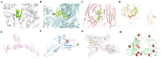 Molecular docking results of LUT with eight potential targets on the axon guidance pathway: (A) LUT and EPHB4; (B) LUT and SEMA7A; (C) LUT and EPHA4; (D) LUT and EFNA5; (E) LUT and L1CAM; (F) LUT and UNC5B; (G) LUT and NTNG1; and (H) LUT and DCC.