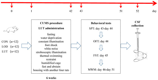 Experimental timeline. LOD: late-onset depression; LUT: luteolin; CUMS: chronic unpredictable mild stress; SPT: sucrose preference test; OFT: open field test; FST: fast swimming test; MWM: Morris water maze test; and CSF: cerebrospinal fluid.