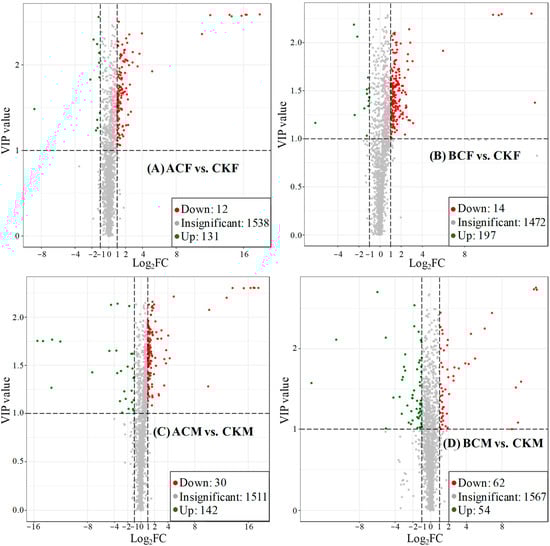 Volcano plots of the differential metabolites of (A) ACF vs. CKF; (B) BCF vs. CKF; (C) ACM vs. CKM; (D) BCM vs. CKM. VIP denotes the variable’s importance in the projection value. FC denotes the fold variable value.