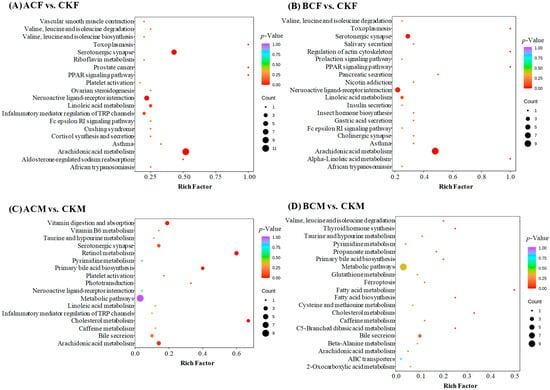 The enriched KEGG pathway terms covered by differential metabolites: (A) ACF vs. CKF; (B) BCF vs. CKF; (C) ACM vs. CKM; (D) BCM vs. CKM.
