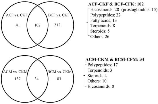 To analyze the influence of sex on the differential metabolite profiles of zebrafish after being exposed to AC and BC, Venn diagrams showing consistent metabolite profiles between different comparisons were established (Figure 3). A total of 102 common metabolites showed consistent profiles in zebrafish females exposed to AC and BC, most of which (100/102) were upregulated (Figure 3; Table S2). The number of upregulated eicosanoids (28 members) was higher than that of other metabolite classes, about half of which were PGs (15 members), indicating that both AC and BC could induce the PG metabolite profiles in zebrafish females. However, no eicosanoids existed in the joint different metabolites between ACM vs. CKM and BCM vs. CKM (Figure 3; Table S3). Only 34 differential metabolites (24 upregulated and 10 downregulated) were found with coincident responses to AC and BC in zebrafish males. Half of the joint different metabolites in male fish exposed to AC and BC were polypeptides. It is interesting to note that zebrafish males exhibit a significantly different response to AC and BC. These results indicated that some key physiological and metabolic activities leading to the synthesis of eicosanoids might be activated under AC and BC in zebrafish, but sex-specific differences persist significantly.