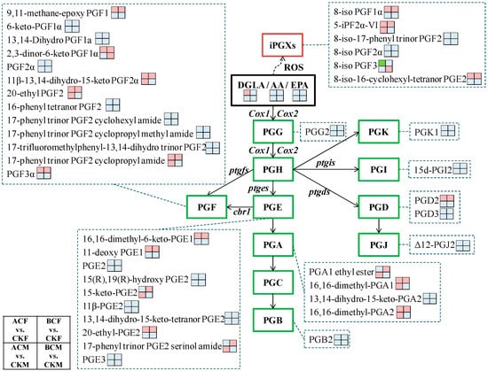 In total, 40 PGs (including iPGs) were found in all the detected zebrafish samples (Table S4). Among them, nine types of PGs (PGA, PGB, PGD, PGE, PGF, PGG, PGI, PGJ, and PGK) were found, including two major PG types (PGFs and PGEs) with 18 and 11 metabolites, respectively (Table S4; Figure 4). All six series of PGs (PGX1, PGX2, PGX3, iPGX1, iPGX2, and iPGX3) were detected in our zebrafish samples, of which PGX2 was the most abundant, with 22 members.