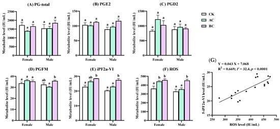 Levels of PGs and ROS determined by ELISA. (A–F) exhibited the levels of total PG, PGE2, PGD2, PGFM (11β-13,14-dihydro-15-keto PGF2α), 5-iPF2a-VI, and ROS; (G) showed a significantly positive correlation between the levels of 5-iPF2a-VI and ROS. Different letters above histograms indicate statistically significant differences among different treatments (p < 0.05).