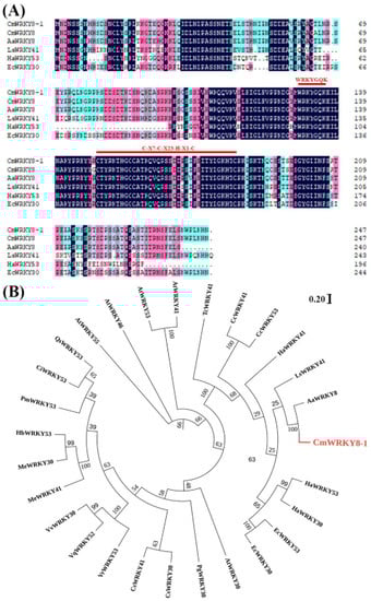 CmWRKY8-1 homologous proteins alignment and phylogenetic tree construction. (A) Comparison of CmWRKY8-1 with other homologous proteins of different species. The red lines mark the WRKYGQK heptapeptide sequence as well as the zinc finger structural domain. (B) Phylogenetic analysis of CmWRKY8-1. Red fonts indicate CmWRKY8-1.