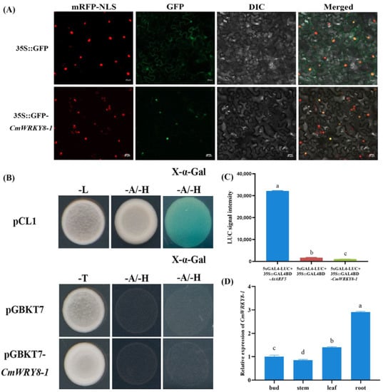 To determine the subcellular localization of CmWRKY8-1, the pORE R4-GFP-CmWRKY8-1 vector or pORE R4-GFP empty vector was infiltrated into the epidermal cells of N. benthamiana leaves. The GFP fluorescence signal of tobacco cells transformed with the pORE R4-GFP-CmWRKY8-1 vector appeared only in the nucleus and overlapped with the nuclear marker (Figure 2A). In conclusion, CmWRKY8-1 was localized in the nucleus.