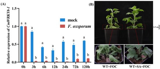 Expression of CmWRKY8-1 under F. oxysporum infection and the phenotype of inoculated chrysanthemums after spraying exogenous SA. (A) Changes in the relative expression of CmWRKY8-1 in ‘Jinba’ after inoculation with F. oxysporum. (B) The control group was inoculated with the fungus after 24 h of spraying sterile water and the experimental group was inoculated with the fungus after 24 h of spraying SA. FOC indicates F. oxysporu.