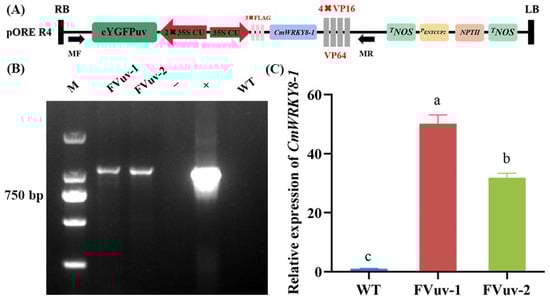 To clarify the function of CmWRKY8-1, we obtained CmWRKY8-1 transgenic lines that overexpressed the CmWRKY8-1–VP64 fusion protein (Figure 4A). We selected FVuv-1 and FVuv-2 as subjects for the CmWRKY8-1 transgenic lines. Through PCR amplification with the 35S forward primer and CmWRKY8-1 reverse primer, transgenic lines of CmWRKY8-1 were identified (Figure 4B). The transgenic lines of CmWRKY8-1 were further analyzed by qRT-PCR (Figure 4C).