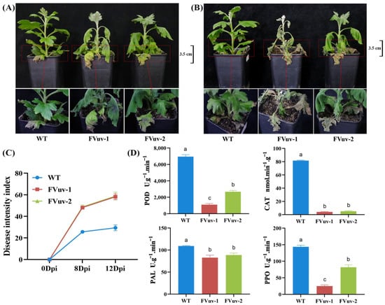 After inoculation with F. oxysporum, we observed that FVuv-1 and FVuv-2 already showed a clear wilting state on the 8th day, whereas WT lines had only a slight wilting at the base (Figure 5A). On the 12th day, the transgenic seedling disease of the FVuv-1 and FVuv-2 lines had spread from the middle to the top of the stem, and the entire plant had died (Figure 5B). The WT lines still had only a few leaves withered at the base. We evaluated and graded chrysanthemum seedlings manually for the degree of root browning and the degree of yellowing and browning of leaves in diseased chrysanthemum seedlings. The DSI of WT lines was significantly lower than that of FVuv-1 and FVuv-2 (Figure 5C). More importantly, we measured the activities of peroxidase (POD), catalase (CAT), phenylalaninammo-nialyase (PAL), and polyphenol oxidase (PPO) enzymes in plants after infection on the 8th day. POD, CAT, PAL, and PPO are critical enzymes in plant defense systems, and can be used as standards to measure plant resistance [,]. The results showed that enzyme contents in FVuv-1 and FVuv-2 were significantly lower than those in WT lines (Figure 5D).