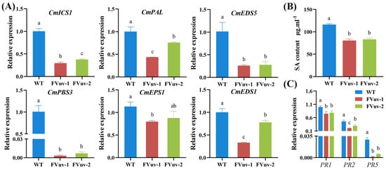 Changes in genes involved in SA signaling pathway and alterations in endogenous SA. (A) Expression of CmICS1, CmPAL, CmEDS5, CmPBS3, CmEPS1, CmEDS1 in CmWRKY8-1 transgenic lines and WT after inoculation with F. oxysporum. (B) Endogenous SA content after inoculation with F. oxysporum. (C) Expression of pathogenesis-related genes involved in the SA signaling pathway.