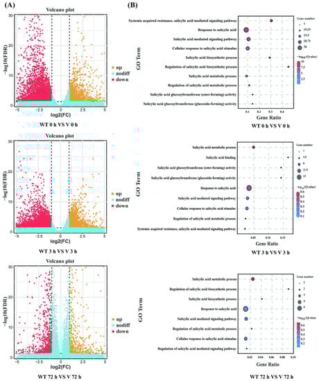 Global analysis of the transcriptome data and DEGs analysis of WT and CmWRKY8-1 transgenic lines. (A) Up- or down-regulated differential gene volcano map between WT and CmWRKY8-1 transgenic lines. (B) Go terms related to the SA pathway.