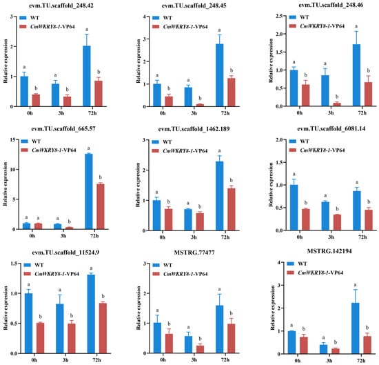 Seedlings of the WT lines and CmWKRY8-1 transgenic lines were planted in a greenhouse at Nanjing Agricultural University for 40 days. After inoculation at 0 h, 3 h, and 72 h, roots of WT lines and CmWKRY8-1 transgenic lines were sampled with three biological replicates. Total RNA was extracted using a TRIzol reagent kit (Invitrogen, Carlsbad, CA, USA) and assessed using an Agilent 2100 Bioanalyzer (Agilent Technologies, Palo Alto, CA, USA). Transcriptome sequencing was performed using an Illumina Novaseq6000 made by the Gene Denovo Biotechnology Co. (Guangzhou, China). The reads were filtered and aligned using Bowtie2 (version 2.2.8) []. Paired-end clean reads were mapped to the reference genome using the HISAT2 software version 2.4 []. Differentially expressed genes (DEGs) between two different groups were identified using DESeq2 software []. The transcripts were annotated using the BLASTX algorithm [] and Gene Ontology database []. The quantification of transcripts was transformed into FPKM values with RSEM [].