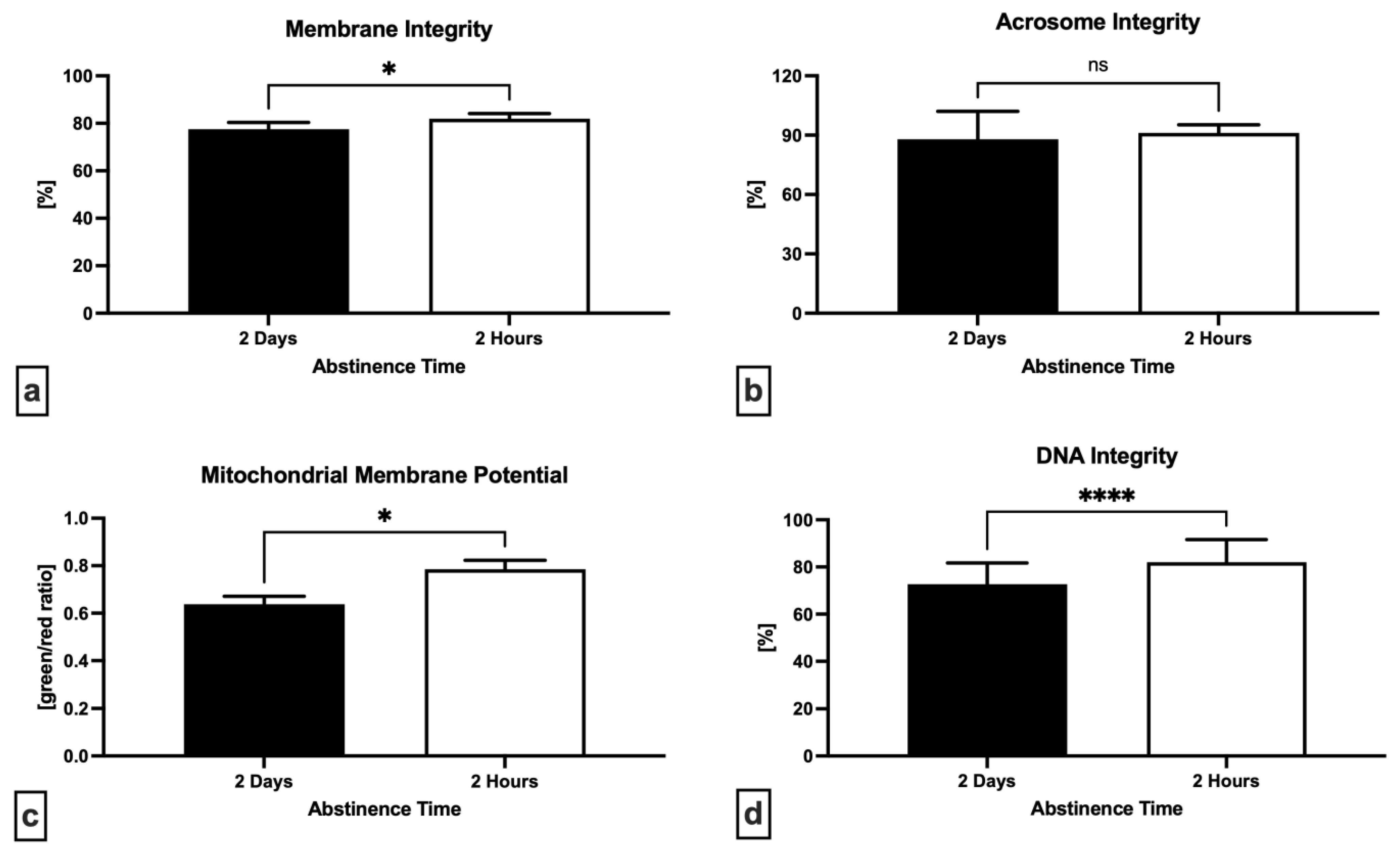 - Dahan, M.H.; Mills, G.; Khoudja, R.; Gagnon, A.; Tan, G.; Tan, S.L. Three hour abstinence as a treatment for high sperm DNA fragmentation: A prospective cohort study. J. Assist. Reprod. Genet. 2021, 38, 227–233. [Google Scholar] [CrossRef] [PubMed]