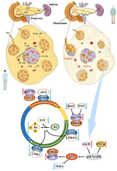 There was a significant reduction in β-cell proliferation and an increase in β-cell apoptosis with age. The p16Ink4a increases with age in islets, inhibiting the phosphorylation of Rb protein by preventing Cdk4/Cdk6 binding to Cyclin D in the early G1 phase. Then the release of E2F transcription factors is blocked and contributes to cell cycle arrest. The increased expression of p16INK4a is associated with the downregulation of Ezh2 and Bmi1. Moreover, the Arginase-II is upregulated in senescent acinar cells and activates the p38 MAPK, leading to the paracrine release of TNF-α and β-cell apoptosis next. The p38 MAPK pathway also alters the levels of WIP1 and p21Cip1 induced by p53. The high expression of p21Cip1 inhibits the phosphorylation of Rb protein by preventing Cdk2 binding to Cyclin E in the late G1 phase. They may also regulate the cell cycle transition from G2 to the M phase by controlling the combination of cdc2 and Cyclin B.