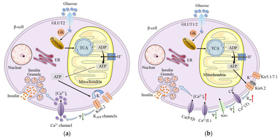 (a) The consensus model of GSIS. Glucose is transported into the β-cells via GLUTs. After that, glucose oxidizes and generates ATP, mainly in the mitochondria, through the TCA cycle or the Krebs cycle. Increased ATP/ADP ratio reduces β-cell KATP conductance, which leads to the depolarization of the cell membrane and initiation of electrical activity. The importance of β-cell electrical activity is that it increases the intracellular Ca2+ concentration, which is required to trigger insulin secretion; (b) Stimulus-secretion coupling in human β-cells. Glucose is transported into the β-cells via GLUT1 and GLUT2 and leads to accelerated mitochondrial glucose metabolism, increased ATP production, and KATP channels closure (consisting of the pore-forming subunit Kir6.2 and the sulfonylurea-binding protein SUR1). Increased membrane resistance (Rm) due to the KATP channels closure allows the opening of T-type Ca2+ channels and a further membrane depolarization. The depolarization activates Na channels and L-type Ca2+ channels. At the peak of the action potential, P/Q-type Ca2+ channels open and trigger exocytosis of insulin granules. ER: endoplasmic reticulum; Rm: membrane resistance; [Ca2+]i: intracellular Ca2+ concentration; Ca2+(T): T-type Ca2+ channels; Ca2+(L): L-type Ca2+ channels; Ca2+(P/Q): P/Q-type Ca2+ channels; Nav: Na channels.