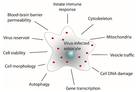 Astrocytes are glial cells with key roles in maintaining the homeostasis of the central nervous system (CNS) [1,2,3]. In addition to their well-recognized roles in sustaining and modulating functioning of neurons in normal physiologic conditions, they also participate in the development and progression of several diseases of the CNS [2,3,4,5]. An increasing amount of data on viral infections of astrocytes, in conjunction with further knowledge of cellular functions that are modified by virus infections (e.g., upregulation of cytokines, vesicular traffic, and autophagy; Figure 1) [6,7,8,9,10,11], have led to a whole new perspective on astrocytes in terms of their contribution to CNS diseases. To date, infections of astrocytes have been documented for viruses from different families, including enveloped positive-sense single-stranded RNA viruses (e.g., Flaviviridae, Coronaviridae, Retroviridae, and Togaviridae), enveloped negative-sense single-stranded RNA (e.g., Paramyxoviridae, Rhabdoviridae, and Bunyaviridae), non-enveloped viruses with a single-stranded RNA (Picomaviridae), and enveloped double-stranded DNA viruses (Herpeseviridae).