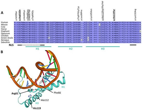 In silico analysis of SOX4 missense variant localization. (A) Sequence alignment of the SOX4 HMG-domain of different species. Previously reported missense variants [8,11] and new missense variants from patients 1 and 3 (bold) are indicated. Variants investigated in the luciferase reporter assay are underlined. Sequences reflecting the α-helices and nuclear localization sites are underlined and indicated by H1–H3 and NLS, respectively [13,14]. (B) Model of the SOX4 HMG-domain forming a complex with DNA based on template 3u2b [13]. Amino acid residues affected in patients are highlighted. New variants from patients 1 and 3 are shown in bold and α-helices (H) of the HMG-domain are indicated by H1, H2, and H3, respectively.