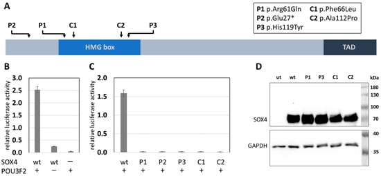 Localization and function of analysed SOX4 variants. (A) SOX4 protein structure. Arrows indicate localization of investigated variants. The high mobility group (HMG) box and the transactivation domain (TAD) are indicated. C1 and C2 served as negative controls [8]. The figure is not drawn to scale. (B) Activation of luciferase gene expression depends on the interaction of SOX4 and POU3F2. The presence and absence of either SOX4 or POU3F2 are indicated by + and −, respectively. The significance of pairwise differences between co-transfection of SOX4 and POU3F2 constructs and single transfection of either construct was verified for each single experiment using Welch’s unpaired t-test, giving a p < 0.02. (C) SOX4-mediated activation was abolished by all SOX4 variants. The presence of POU3F2 is indicated by +. Data shown in (B,C) were normalized for transfection efficiency using constitutive Rluc expression (pRL-TK). Experiments were conducted at least three times independently and the results of one of these experiments are shown. The significance of pairwise differences between the SOX4 wt and either SOX4 variant was verified for each single experiment using Welch’s unpaired t-test, giving a p < 0.02. (D) Western blot showing proper expression of all SOX4 constructs (SOX4Glu27* excluded). ut, untransfected; wt, wildtype.