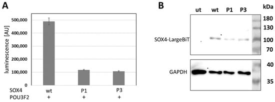 Effects of novel SOX4 variants on protein–protein interaction. (A) Novel SOX4 variants reduced SOX4–POU3F2 interaction dramatically. The presence of POU3F2 is indicated by +. Experiments were conducted three times independently and the results of one of these experiments are shown. The significance of pairwise differences between SOX4 wt and either SOX4 variant was verified for each single experiment using Welch’s unpaired t-test, giving a p < 0.02. (B) Western blot showing the proper expression of the transfected SOX4 constructs. AU, arbitrary unit; wt, wildtype; P1, p.Arg61Gln; P3, p.His119Tyr; ut, untransfected.