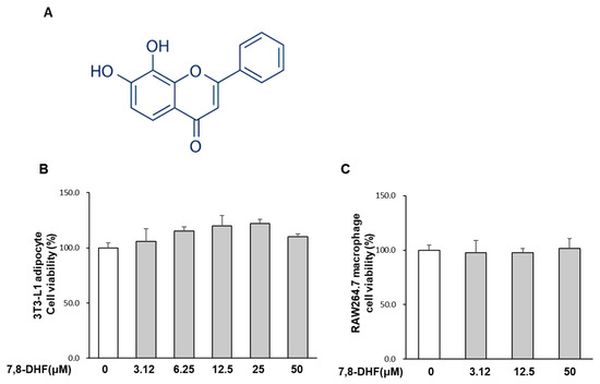 As shown in Figure 1B,C, 7,8-DHF did not inhibit the viability of hypertrophied mature adipocytes and RAW 264.7 macrophages up to 50 μM. Thus, cells were treated with the non-cytotoxic range of 7,8-DHF in all subsequent experiments.
