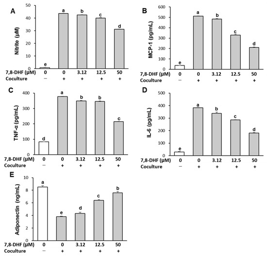 Hypertrophied 3T3-L1 cells and RAW 264.7 macrophages were cocultured for 24 h and then treated with 7,8-DHF (3.12, 12.5, and 50 μM). After 24 h of incubation, the cell culture supernatants were collected and used for assays. The accumulation of nitrite, a stable end product of NO, was quantified by the Griess method. In brief, 100 μL of supernatant was mixed with the same volume of Griess reagent (1% sulfanilamide in 5% phosphoric acid, 0.1% N-(1-naphthyl) ethylenediamine in H2O). After incubating at room temperature for 10 min, the absorbance at 540 nm was measured using a microplate reader (ELx808, Biotek). The nitrite concentrations were calculated from a standard sodium nitrite curve. The MCP-1, TNF-α, IL-6, and adiponectin concentrations in the culture supernatants were measured using ELISA kits according to the manufacturer’s instructions.