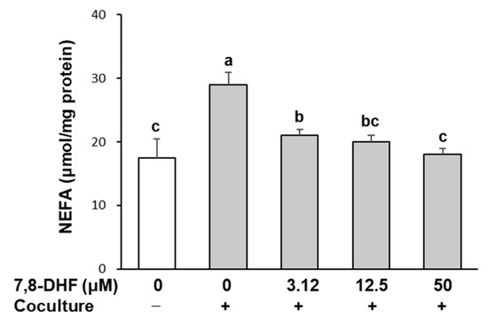 Lipolysis was determined by measuring the NEFA released to the culture medium from adipocytes. Hypertrophied 3T3-L1 cells were cocultured with RAW 264.7 macrophages for 24 h. After washing with phosphate-buffered saline (PBS), cells were incubated in Krebs–Ringer bicarbonate buffer (119 mM NaCl, 4.8 mM KCl, 1.28 mM CaCl2, 1.2 mM KH2PO4, 1.2 mM 7H2O·MgSO4, 0.25 mM NaHCO3, 5 mM glucose, 4% bovine serum albumin; pH 7.4) containing 7,8-DHF (3.12, 12.5, and 50 μM) for 24 h. The NEFA content in the culture medium was measured by an assay kit, and the protein concentration of the pellets was quantified for calibration.