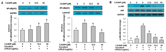 To clarify the mechanisms underlying the anti-inflammatory action of 7,8-DHF in cocultured cells, the NF-κB signaling pathway and JNK phosphorylation were examined. NF-κB is a critical transcription factor that increases the expression of genes encoding pro-inflammatory mediators, such as inducible NO synthase (iNOS), TNF-α, IL-6, and MCP-1 [25]. The primary mechanism in NF-κB activation is that the complex of cytoplasmic inhibitor κB proteins (IκB)—NF-κB is degraded by IκB kinase (IKK) to release NF-κB subunits, leading to NF-κB nuclear translocation and subsequent binding of NF-κB to promoter regions of target genes [25]. We measured the NF-κB p65 subunit in cytosolic and nuclear fractions to estimate the NF-κB translocated from the cytosol to the nucleus. As shown in Figure 4A, LPS treatment to induce IκBα degradation increased the nuclear content of p65 by 1.6-fold. However, when the coculture was treated with 7,8-DHF at concentrations with obvious anti-inflammatory effects (12.5 and 50 μM in the absence of LPS, Figure 2), the nuclear translocation of the NF-κB p65 protein decreased by 16% and 50%, respectively, compared with the LPS-treated coculture control (p < 0.01). The effect of 7,8-DHF on the phosphorylation of JNK is shown in Figure 4B. Coculture of hypertrophied adipocytes with macrophages slightly increased the phosphorylation of JNK, which was further stimulated by LPS treatment. However, 7,8-DHF treatment suppressed the LPS-induced phosphorylation of JNK in cocultured cells in a dose-dependent manner (p < 0.001). The phosphorylation of JNK recovered to the level of the control culture upon treatment with 50 μM 7,8-DHF.