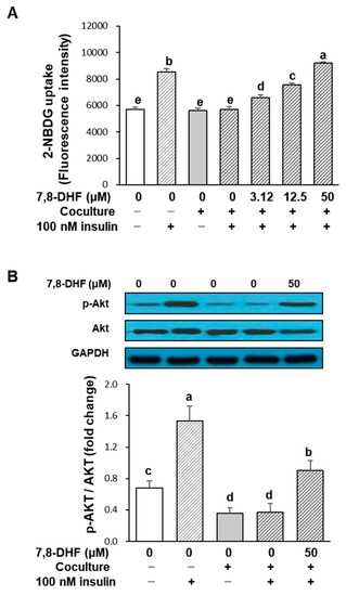 The effect of 7,8-DHF on glucose uptake in the coculture of adipocytes and macrophages is represented in Figure 5A. The incorporation of 2-deoxy-2-[(7-nitro-2,1,3-benzoxadiazol-4-yl) amino]-D-glucose (2-NBDG), a fluorescent glucose derivative, was increased in hypertrophied 3T3-L1 adipocytes without coculture by insulin (fluorescence intensity increased from 3497 ± 160 to 8515 ± 287), while the uptake was not significantly changed in cocultured cells in response to insulin (fluorescence intensity increased from 5618 ± 157 to 5695 ± 210). This result shows that the coculture of hypertrophied 3T3-L1 adipocytes and RAW 264.7 macrophages led to insulin resistance. However, the coculture-induced insulin resistance was recovered upon 7,8-DHF treatment in a dose-dependent manner (p < 0.001). 7,8-DHF concentrations of 3.12, 12.5, and 50 μM increased 2-NBDG uptake by 15% (6572 ± 222), 33% (7572 ± 121), and 62% (9192 ± 94), respectively, compared with the insulin-treated coculture control. The 50 μM concentration of 7,8-DHF was sufficient to restore the coculture to the insulin sensitivity of the control adipocytes. To find a possible explanation for the increase in glucose uptake observed in 7,8-DHF-treated adipocytes, we investigated whether the phosphorylation of Akt, a critical factor linking the glucose transporter type four (GLUT4) to the insulin signaling pathway, was involved. As shown in Figure 5B, insulin markedly enhanced the phosphorylation of Akt in the control culture, whereas it did not affect Akt phosphorylation in cocultured cells. Meanwhile, the treatment with 50 μM 7,8-DHF more than doubled the Akt phosphorylation, although it did not reach the level of the insulin-treated control culture. Thus, the recovery of glucose uptake by 7,8-DHF was at least partly ascribed to the increased Akt phosphorylation.