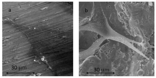In Figure 4, the osteoblasts on the MA surface (a) and on the surface (SB+AE) can be observed at higher magnifications. It can be observed that the morphology of the cells is flat, with greater activity on the rough SB+AE surface where there is greater dorsal activity with filopodia and some whitish nuclei on the surface, which could be attributed to the permineralization activity of the osteoblastic cell.