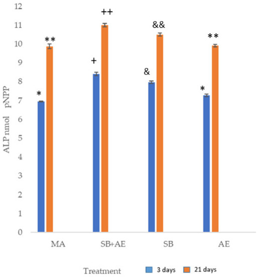 Indeed, our results agree with the studies of [19,21,46,47], which showed that cells cultured on rougher surfaces tended to show more differentiated osteoblast attributes than cells cultured on smoother surfaces. ALP activity was much higher (p-value < 0.001) on SB+AE and SB surfaces than on all M or AE throughout the experimental period (Figure 3). Significant differences were observed among all samples reaching the maximum ALP activity between 3 and 21 days of culture.