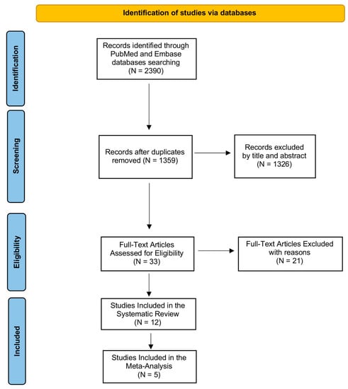 We illustrated the entire screening process in Figure 1 through the PRISMA-P flowchart. During the first step of the search by using the above-mentioned keywords, we identified 2390 records in PubMed (MEDLINE) and Embase (OVID) databases. After removing duplicates, we obtained 1359 records, which were analyzed by title and abstract in order to evaluate their eligibility. We excluded 1326 articles after reading the title and abstract because they were not relevant to our review question. Then, we examined the full text of 33 articles for eligibility, excluding 21 records as they did not match the established inclusion and exclusion criteria. We included 12 studies in our systematic review as shown by the PRISMA Flowchart reported in Figure 1 since evaluated PTX3 in COVID-19 patients, and specifically comparing COVID-19 patients to healthy subjects or analyzing PTX3 levels in the stratification of COVID-19 hospitalized.