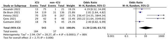 The combination of 5 studies in meta-analysis resulted in a total of 543 ICU vs. 515 non-ICU patients. The meta-analysis carried out shows that there is a significant increase in mortality in ICU patients (184 out of 543) compared to non-ICU patients (37 out of 515); OR: 11.30 (95% CI: 2.00–63.73; p = 0.006). This aspect, as stated by the included studies, is directly correlated to the increase in serum PTX3, which therefore, in addition to being useful in predicting the patient’s hospital stratification, also constituting a predictor of death.