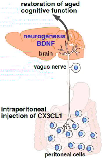 More recently, we found that peritoneal cells transduced signals to the brain through the vagus nerve, increasing hippocampal BDNF expression (Figure 1) []. Administration of the chemokine CX3CL1 into the peritoneal cavity of aged mice augmented hippocampal BDNF expression []. The CX3CL1-induced BDNF expression was abolished via vagotomy, indicating that the vagus nerve is involved in the signalling pathway from administered CX3CL1 to the hippocampus. As expected from the augmented expression of BDNF in the hippocampus, intraperitoneal administration of CX3CL1 increased the number of hippocampal Type-2 NSCs and improved novel object recognition memory that is impaired by advancing age []. Since Type-2 NSCs are thought to be an intermediate stage between radial glial cell-like NSCs and mature neurons [,], these results suggested an increase in adult hippocampal neurogenesis. Moreover, CX3CL1 improved age-associated phenotypic changes of peritoneal cells in aged mice, expression of the senescence marker p16INK4a and phagocytic activity []. When peritoneal cells prepared from CX3CL1-treated aged donor mice were transplanted into the peritoneal cavity of recipient aged mice, age-related impairment of novel object recognition memory was improved. This suggests that peritoneal cells are involved in the signalling pathway of CX3CL1-induced BDNF expression in the hippocampus of aged mice.