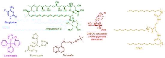 Structure of some antifungal drugs and antifungal cationic ammonium derivatives including carbohydrates and surfactants.