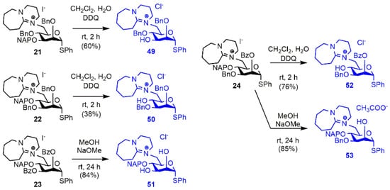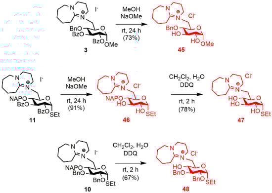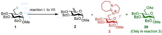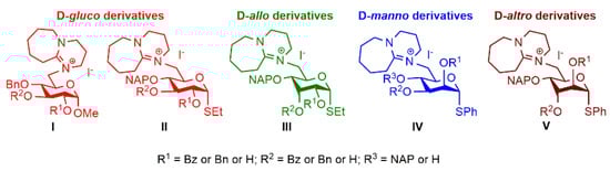 During our previous work, when we studied the elimination reaction of 6-iodo-hexopyranoside derivatives, completely new 1,8-diazabicyclo(5.4.0)undec-7-ene (DBU)-conjugated quaternary amidinium salts were isolated as side products (I–V, Figure 2) [27,28].
