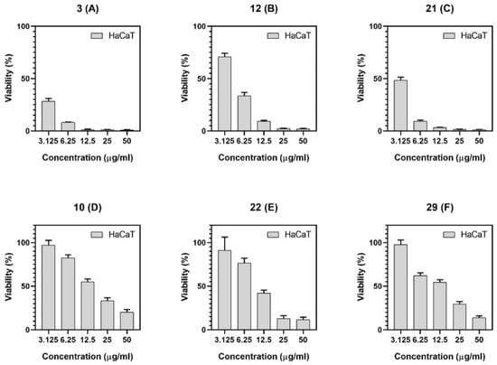 The effect of 3, 10, 12, 21, 22 and 29 on viability of HaCaT cell line. (A) Cytotoxic activity of compound 3; (B) Cytotoxic activity of compound 12; (C) Cytotoxic activity of compound 21; (D) Cytotoxic activity of compound 10; (E) Cytotoxic activity of compound 22; (F) Cytotoxic activity of compound 29.