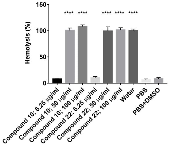 The hemolytic activity of compounds 10 and 22 was determined on freshly isolated rat red blood cells (Figure 4). Both compounds showed a dose-dependent hemolytic activity. At 6.25 µg/mL they did not cause significant hemolysis compared to the negative control PBS (p > 0.05); however, at 50 and 100 µg/mL they caused significant haemoglobin release (p < 0.0001) and their effect were comparable to the hemolytic effect of water used as positive control.